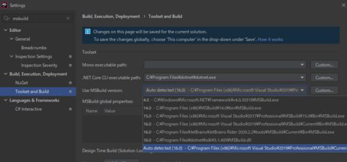 今日はRider 関連の Tipsです。 環境は Rider 2020.3となります。 File -> Settings->Build , Execution , Depliyment項にある Use MSBuild versionから変更できます。 (Settings欄の検索欄に MSBuildと打ち込んでしまうのが楽だと思います) 例えば ソリュー…